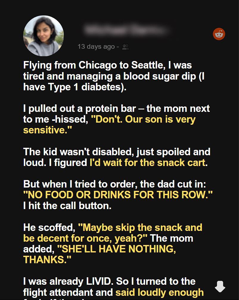 Flying from Chicago to Seattle, I was tired and managing a blood sugar dip (I have Type 1 diabetes). I pulled out a protein bar—the mom next to me hissed, “Don’t. Our son is very sensitive.” The kid wasn’t disabled, just spoiled and loud. I figured I’d wait for the snack cart. But when I tried to order, the dad cut in: “NO FOOD OR DRINKS FOR THIS ROW.” I hit the call button. He scoffed, “Maybe skip the snack and be decent for once, yeah?” The mom added, “SHE’LL HAVE NOTHING, THANKS.” I was already LIVID. So I turned to the flight attendant and said loudly enough for half the plane, “Hi, I’m diabetic. I need to eat something or I could have a medical emergency. They do not get to dictate what I do with my body.