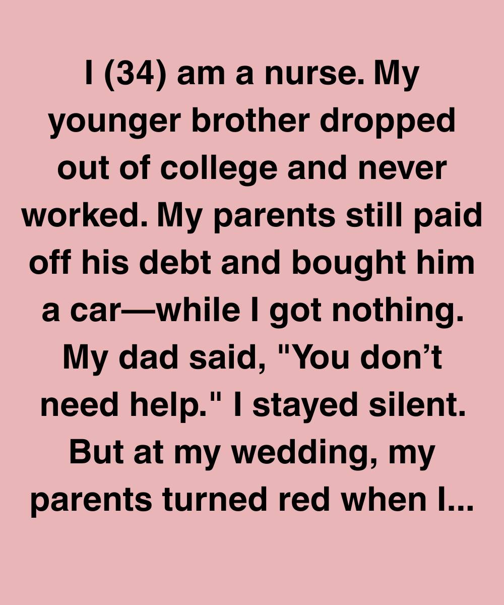 I (34) am a nurse. My younger brother dropped out of college and never worked. My parents still paid off his debt and bought him a car—while I got nothing. My dad said, “You don’t need help.” I stayed silent. But at my wedding, my parents turned red when I thanked only my late grandmother for helping me through nursing school.