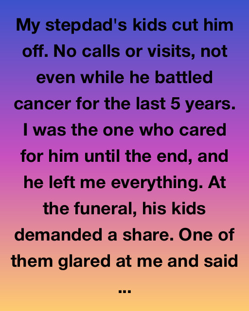 My stepdad’s kids cut him off. No calls or visits, not even while he battled cancer for the last 5 years. I was the one who cared for him until the end, and he left me everything. At the funeral, his kids demanded a share. One of them glared at me and said, “You don’t deserve a cent. You’re not even blood.”