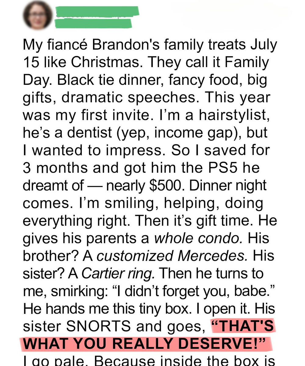 The next day, Brandon appeared with a designer bag, saying the prank wasn’t his idea and that this was my “real” gift.