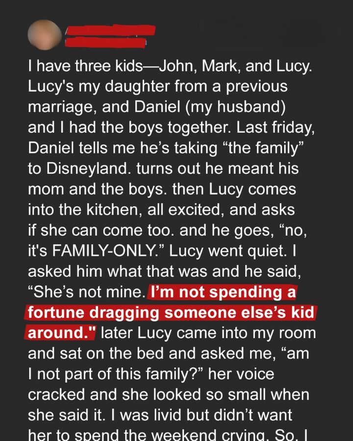 I asked him what that was and he said, “She’s not mine. I’m not spending a fortune dragging someone else’s kid around.” later Lucy came into my room and sat on the bed and asked me, “am I not part of this family?” her voice cracked and she looked so small when she said it.