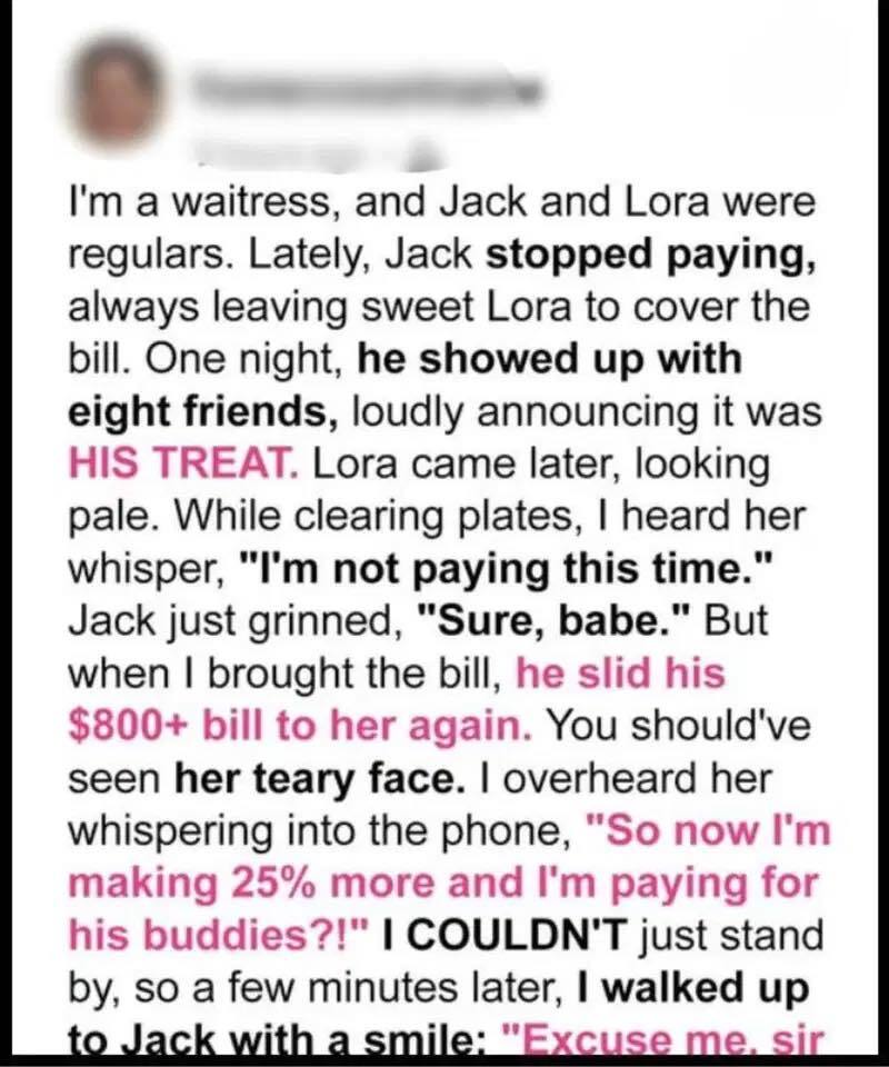 I’m a waitress, and Jack and Lora were regulars. Lately, Jack stopped paying, always leaving sweet Lora to cover the bill. One night, he showed up with eight friends, loudly announcing it was HIS TREAT. Lora came later, looking pale. While clearing plates, I heard her whisper, ‘I’m not paying this time.’ Jack just grinned, ‘Sure, babe.’ But when I brought the bill, he slid his $800+ bill to her again. You should’ve seen her teary face. I overheard her whispering into the phone, ‘So now I’m making 25% more and I’m paying for his buddies?!’ I COULDN’T just stand by, so a few minutes later, I walked up to Jack with a smile: ‘Excuse me, sir…’”