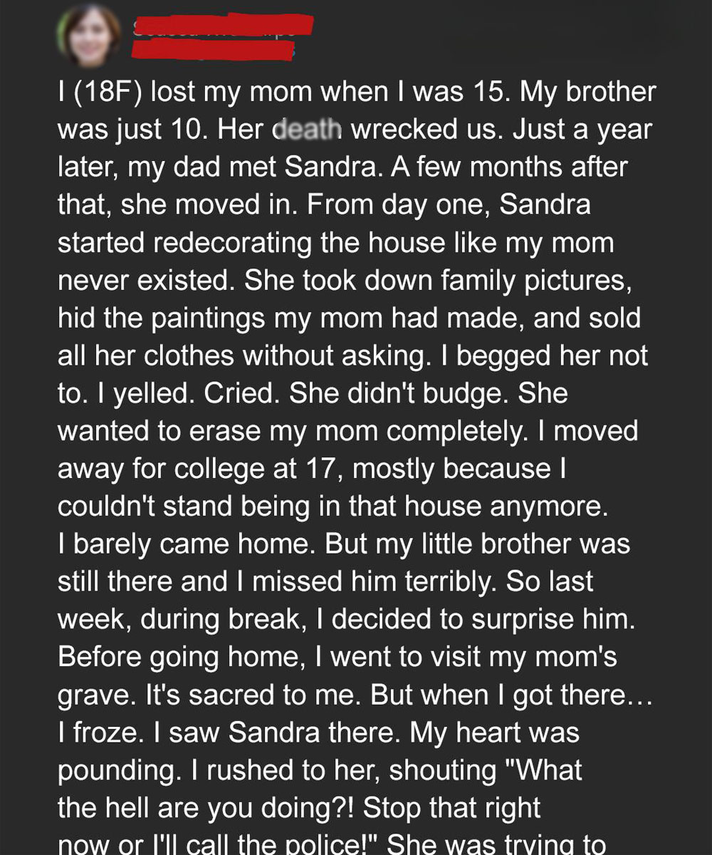 My heart leapt into my throat. Furious, I confronted her, only to discover that she wasn’t desecrating the grave.