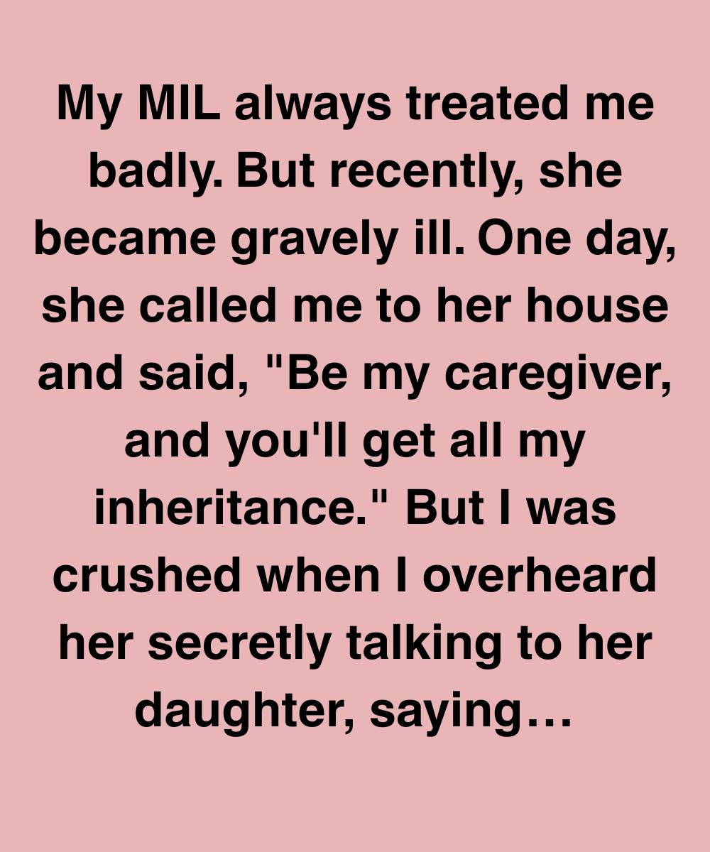 My MIL always treated me badly. But recently, she became gravely ill. One day, she called me to her house and said, “Be my caregiver, and you’ll get all my inheritance.” But I was crushed when I overheard her secretly talking to her daughter, saying, “Don’t worry, sweetie. Once I’m gone, everything’s still going to you. She’s just too gullible to know it.”