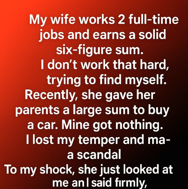 My wife works two full-time jobs and earns a solid six-figure sum. I don’t work that hard—just trying to find myself. Recently, she gave her parents a large amount of money to buy a car, while mine got nothing. I lost my temper, feeling hurt and left out, and caused a scene. To my surprise, she didn’t shout back. She just looked at me calmly and said, “When you find yourself, you’ll understand that giving isn’t about fairness—it’s about gratitude.”