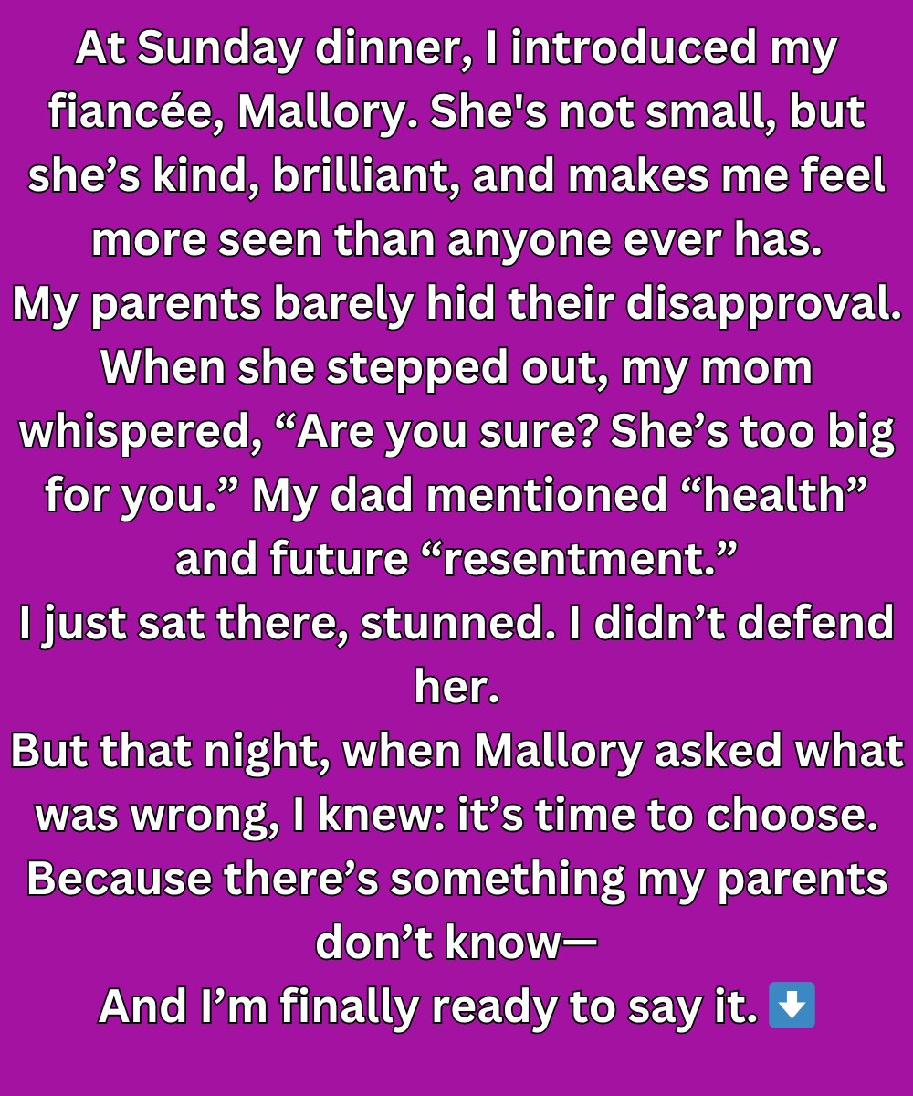 So here’s how the last Sunday dinner went down. I brought my fiancée, Mallory, over to meet my parents officially. She’s tall, broad-shouldered, platinum blonde, and yeah—she’s not a size two. But Mallory’s the warmest, sharpest, most loyal person I’ve ever met. She lights up every room she walks into, even if she doesn’t fit into whatever narrow box people expect.