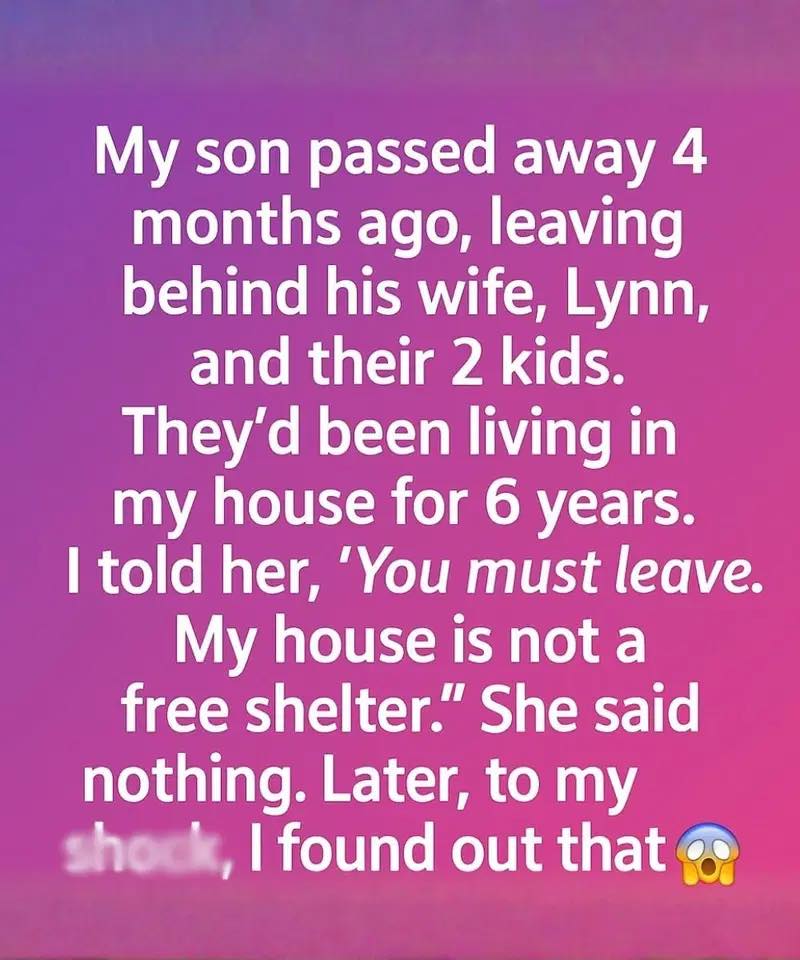 Days later, I found a letter my son had written before his d3ath. In it, he asked Lynn to stay in our home if anything ever happened to him and he wanted his family surrounded by love and familiarity, not loneliness. Reading those words shattered me. I realized I had not only betrayed Lynn’s trust but also gone against my son’s final wish.
