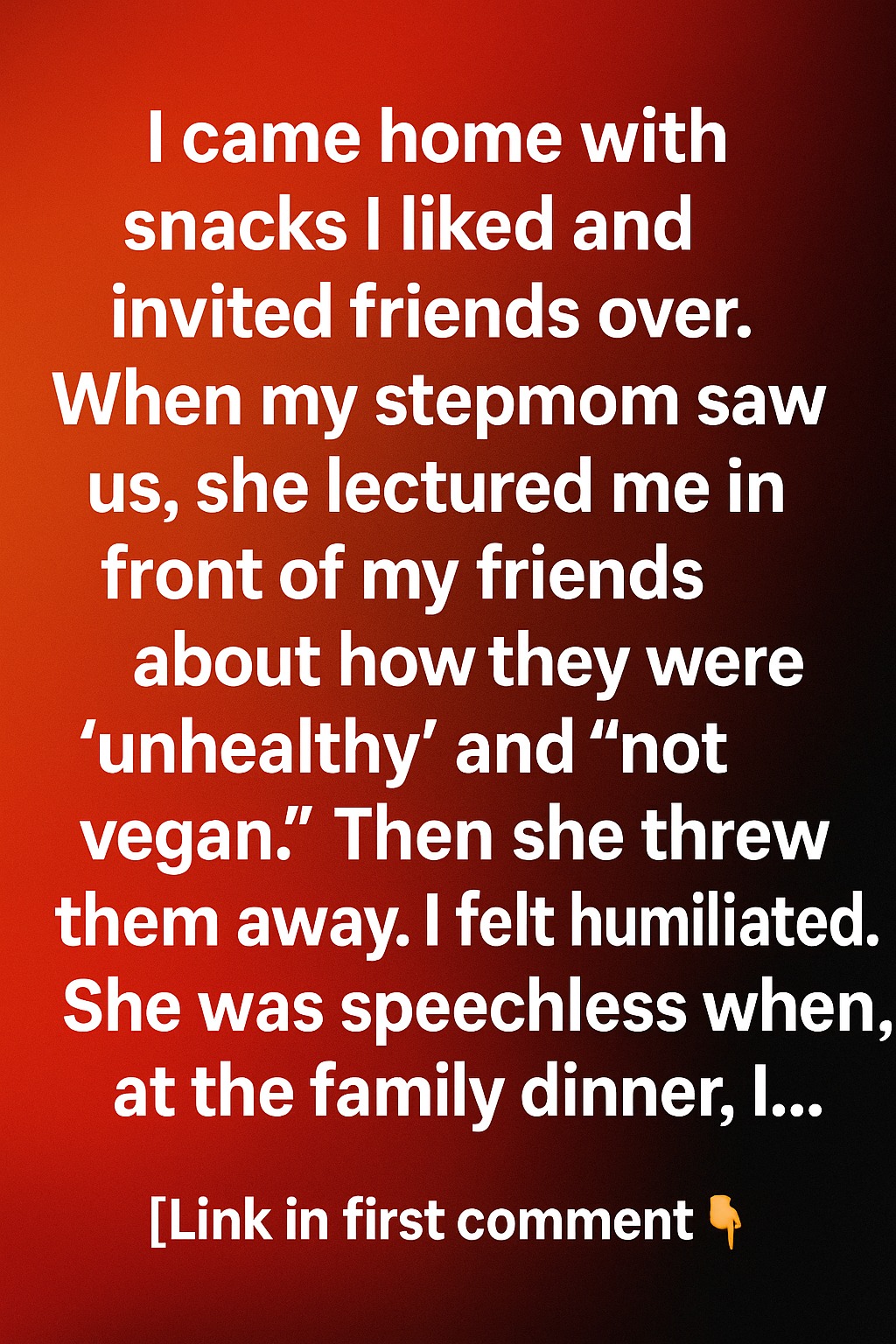I came home with snacks I liked and invited friends over. When my stepmom saw us, she lectured me in front of my friends about how they were “unhealthy” and “not vegan.” Then she threw them away. I felt humiliated. My friends sat in stunned silence, and I could feel my cheeks burning with embarrassment.