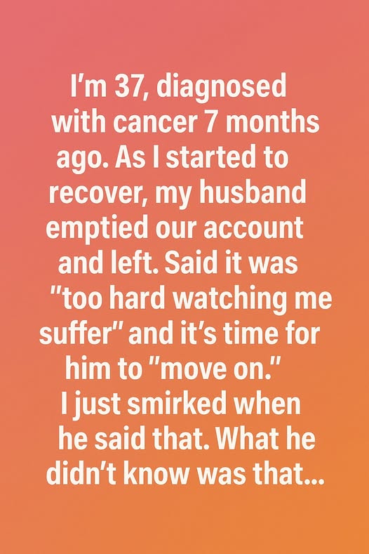I’m 37, diagnosed with cancer 7 months ago. As I started to recover, my husband emptied our account and left. Said it was “too hard watching me suffer” and it’s time for him to “move on.” I just smirked when he said that. What he didn’t know was that …I had already prepared for the worst—not just medically, but emotionally and financially. A few months earlier, I had placed most of my savings into a separate account under my name after noticing his growing distance. I hoped I’d never need it.