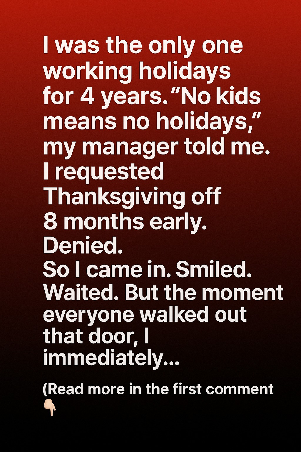 I was the only one working holidays for 4 years. “No kids means no holidays,” my manager told me. I requested Thanksgiving off 8 months early. Denied. So I came in. Smiled. Waited. But the moment everyone walked out that door, I immediatel …sent in my resignation email—with a two-sentence note: