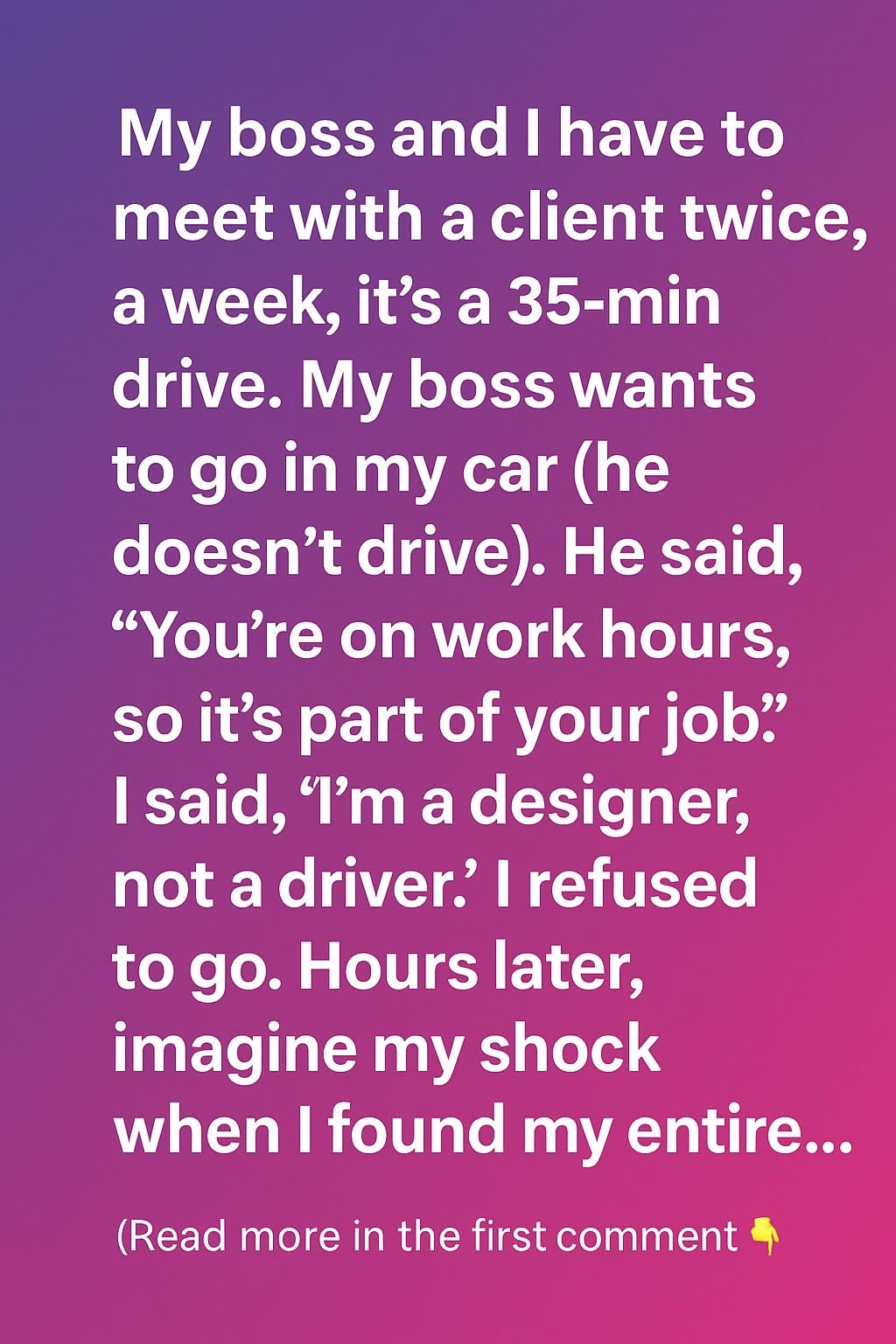 My boss and I were required to meet a client twice a week, a 35-minute drive away. Since he didn’t drive, he assumed I’d take him in my car, insisting it was “part of my job” because it was during work hours. I calmly explained, “I’m a designer, not a driver, and my car isn’t…