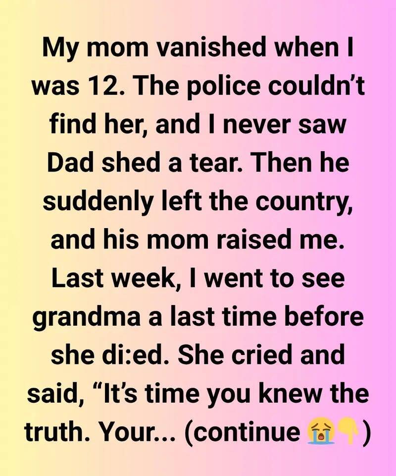 My mom vanished when I was 12. The police couldn’t find her, and I never saw Dad shed a tear. Then he suddenly left the country, and his mom raised me. Last week, I went to see grandma a last time before she di:ed.
