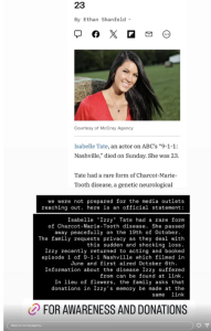 Isabelle Tate, whose acting career was just beginning to blossom, has died. Her agency, McCray Agency, announced the news in an Instagram Story, saying she passed away peacefully from a rare form of Charcot-Marie-Tooth disease (CMT).