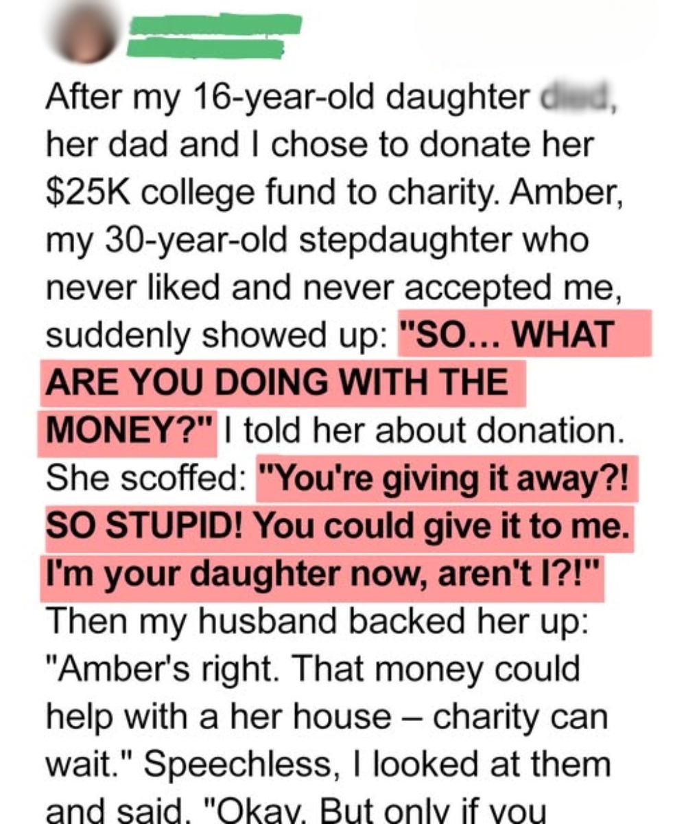 This woman, who had spent years seeing me as an invader in her father’s life, was now claiming family privilege over my deceased child’s college fund.