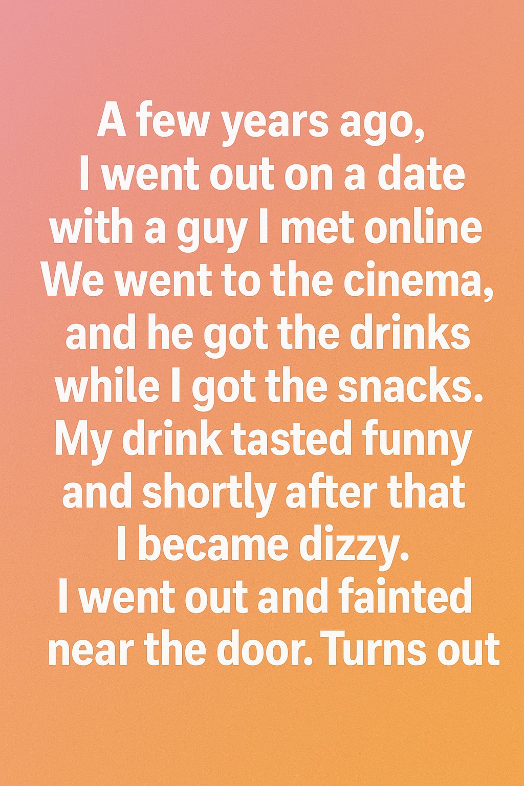 I went out on a date with a guy I met online. We had been chatting for a few weeks, and he seemed kind and funny, so when he suggested watching a movie together, I agreed. At the cinema, I offered to grab the snacks while he went to get the drinks. When we sat down, I noticed my drink tasted a little strange, but I didn’t think much of it at first. A few minutes later, I began to feel dizzy, my vision blurred, and before I knew it, I fainted near the exit door.