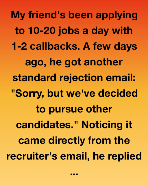 My friend’s been applying to 10–20 jobs a day with 1–2 callbacks. A few days ago, he got another standard rejection email: “Sorry, but we’ve decided to pursue other candidates.” Noticing it came directly from the recruiter’s email, he replied…