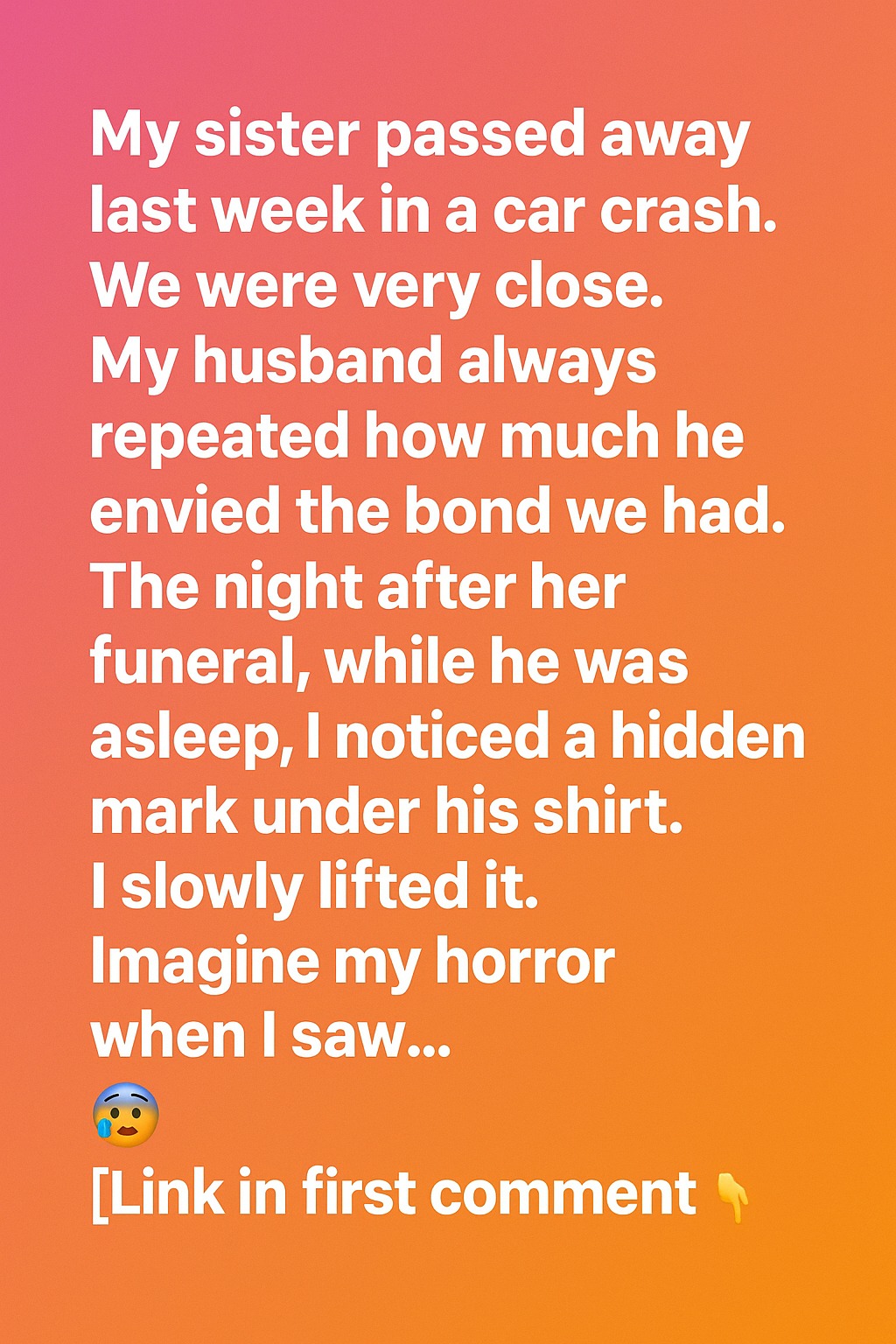 In that still moment, my heart softened. Grief can twist what we see until love looks like pain. But love, in its truest form, never leaves — it simply changes shape. The mark under his shirt became a symbol of shared loss, of two hearts mourning the same soul. I lay back beside him, whispered my sister’s name into the dark, and felt, for the first time since she was gone, that maybe she wasn’t really gone at all.