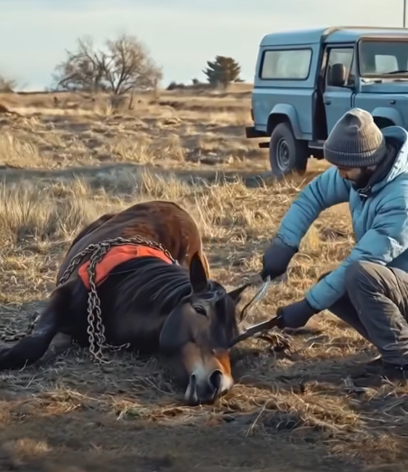 Then began an arduous task. Every link was welded with rust, every movement of the cutters felt like a battle. Between efforts, Ovidiu stroked the horse’s neck and spoke in a soothing voice: Just a little longer… freedom is so close.