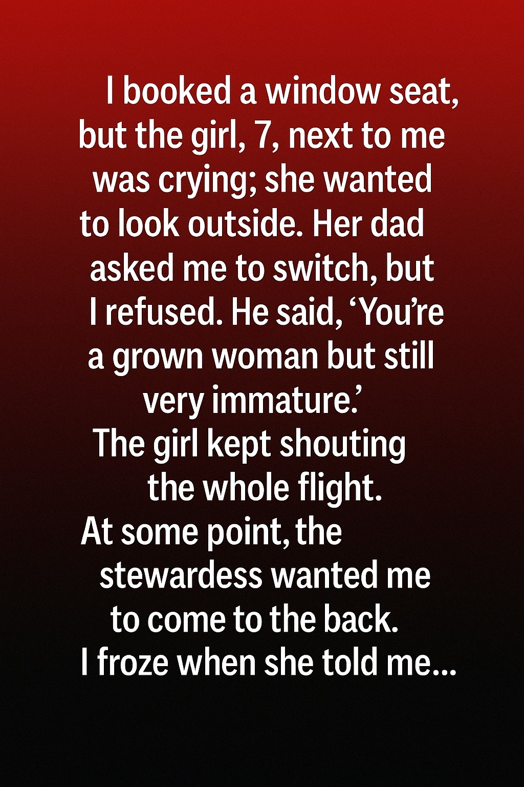 Her father leaned toward me and kindly asked if we could switch seats so she could look out. I smiled politely but explained that I had booked this seat ahead of time for a reason. He sighed, then muttered, “You’re a grown woman but still very immature.” His words stung a little, but I held my ground. Throughout the flight, the girl’s cries echoed softly, making the situation uncomfortable for everyone.
