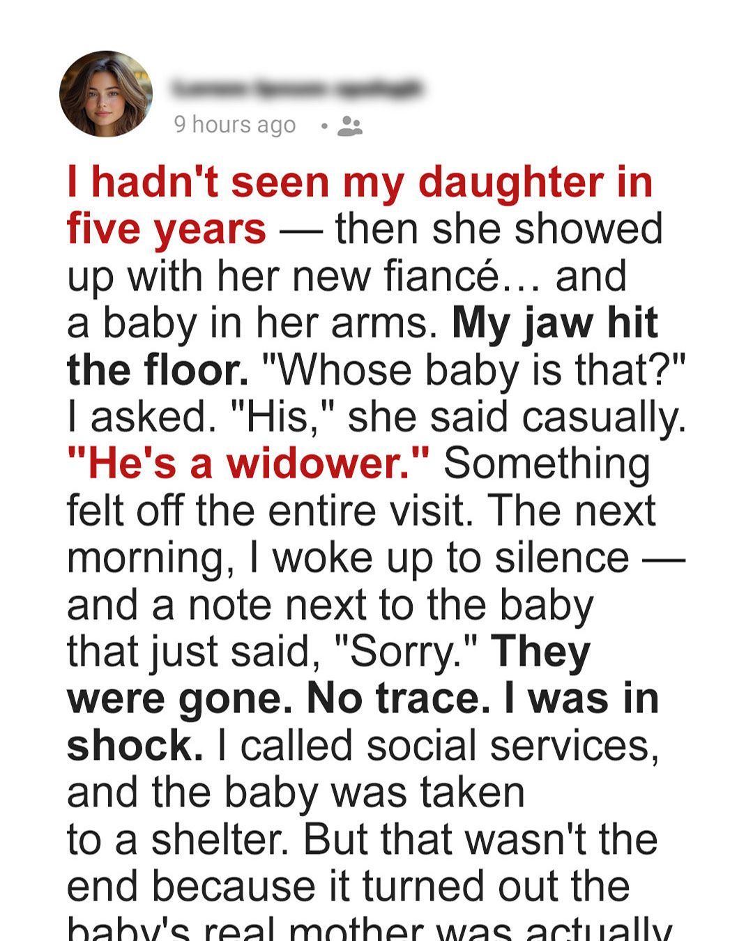 The next morning, I woke to Chloe’s cries and an empty guest room. Elena and Darren were gone, leaving only a short note beside the crib. I tried calling her over and over, but the line was disconnected. With no other choice, I contacted social services to make sure Chloe was safe. Days later, I learned something even more unexpected: Chloe’s biological mother was alive and receiving treatment at a hospital.
