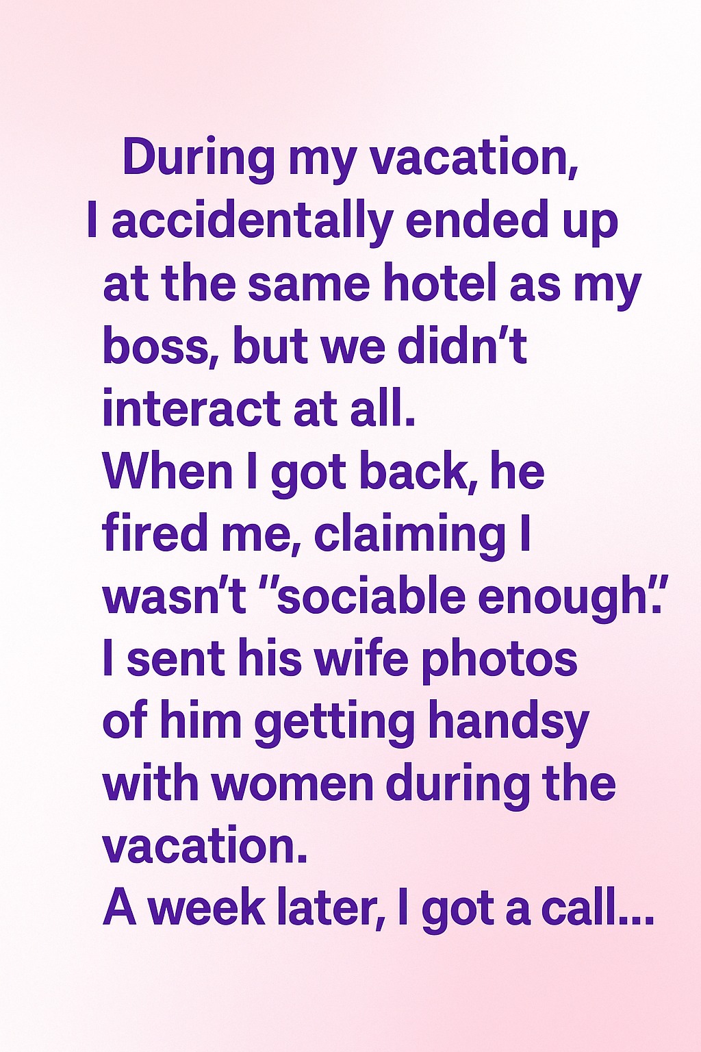 However, when I got back, everything changed. My boss called me into his office and abruptly fired me. His reason? He claimed I “wasn’t sociable enough” during the trip. I was stunned. My performance had always been strong, and the vacation wasn’t a work event. It felt unfair and personal. That’s when I remembered the photos I had seen during my stay—photos of him acting inappropriately with strangers at the hotel bar.