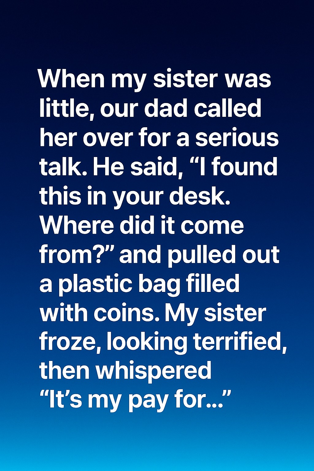When my sister was little, our dad called her over for a serious talk. He said, “I found this in your desk. Where did it come from?” and pulled out a plastic bag filled with coins. My sister froze, looking terrified, then whispered, “It’s my pay for… helping Mrs. Green.”