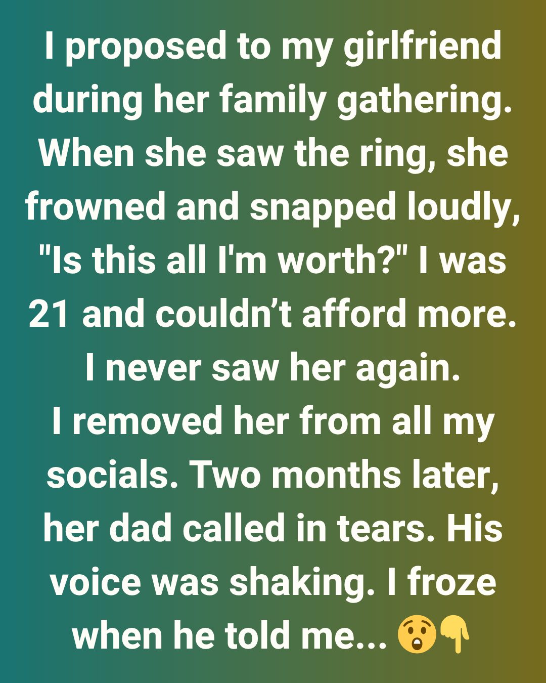 That call gave me closure. I didn’t return to the relationship, but I forgave her in my heart. Years later, I realized that night had taught me something valuable: real love isn’t measured by the price of a ring, but by the respect and kindness shared in difficult moments. Sometimes, what breaks us ends up shaping us for the better.
