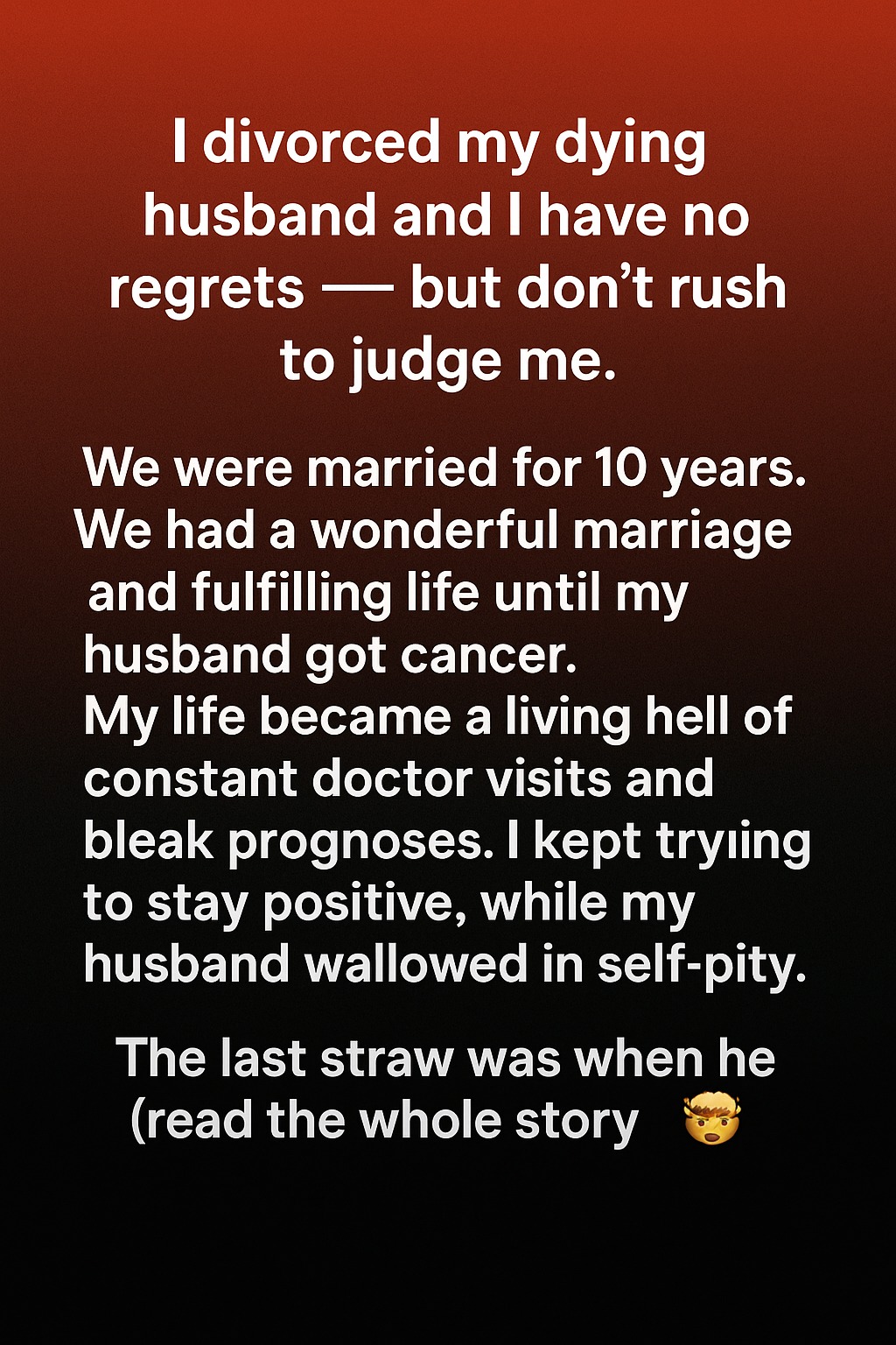 One day, after another emotionally draining appointment, something inside me shifted. I realized that I was living a life defined entirely by his illness, and I had lost my sense of self. It wasn’t a decision made out of anger or frustration — it was one born from exhaustion and clarity. I wanted to live again, not just exist in a cycle of sadness. With a heavy heart, I chose to end the marriage.