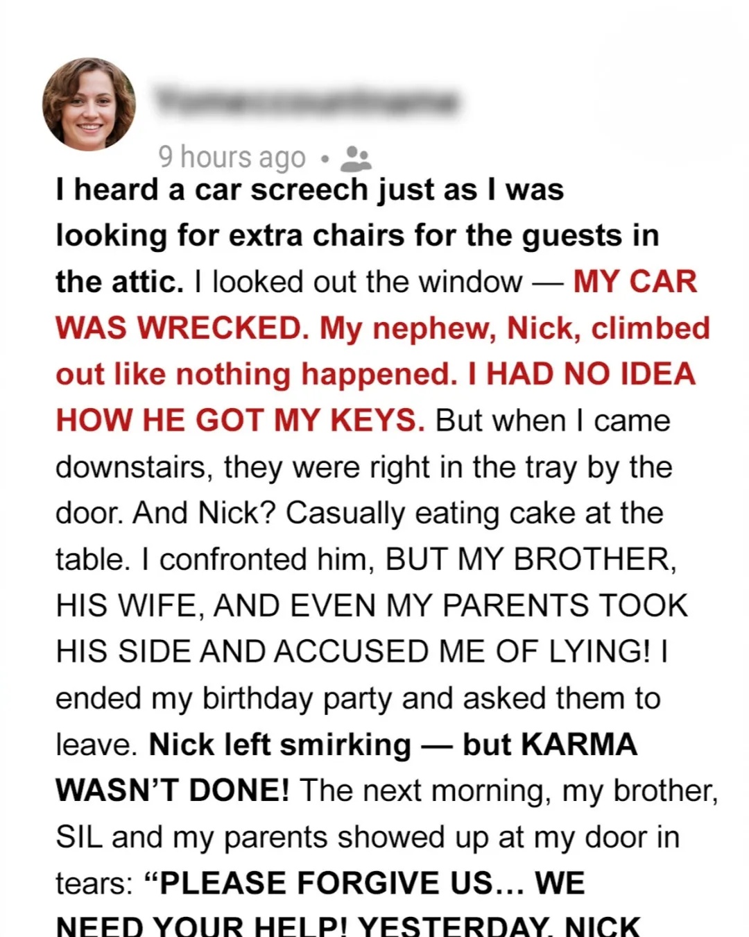 On my 40th birthday, I hosted a cozy party at my home. Friends filled the space with warmth, and even my family showed up—though their usual judgment lingered in the air. While grabbing extra chairs from the attic, I heard the sound of tires outside. Looking out, I saw my SUV damaged against a neighbor’s mailbox, and Nick, my teenage nephew, casually walking back toward the house. But when I confronted him, everyone denied it happened. It was like my reality didn’t matter.