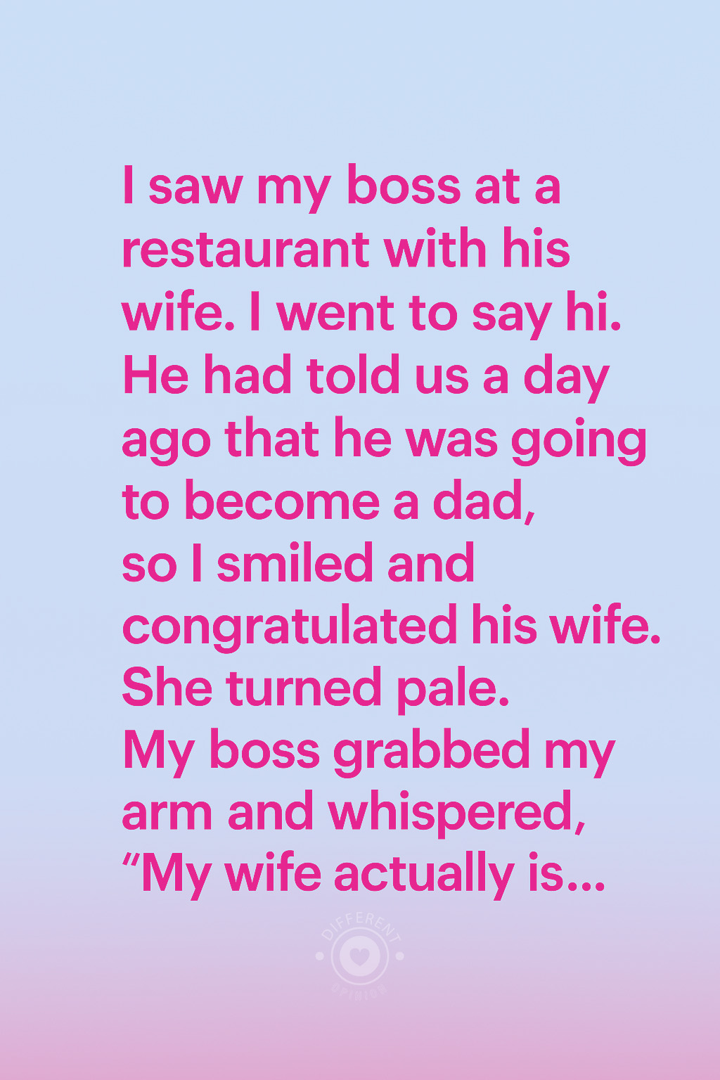 “I saw my boss at a restaurant with his wife. I went to say hi. He had told us a day ago that he was going to become a dad, so I smiled and congratulated his wife.” She froze at my words, her face draining of color. The clatter of cutlery and murmurs of surrounding diners suddenly receded into silence in my ears.