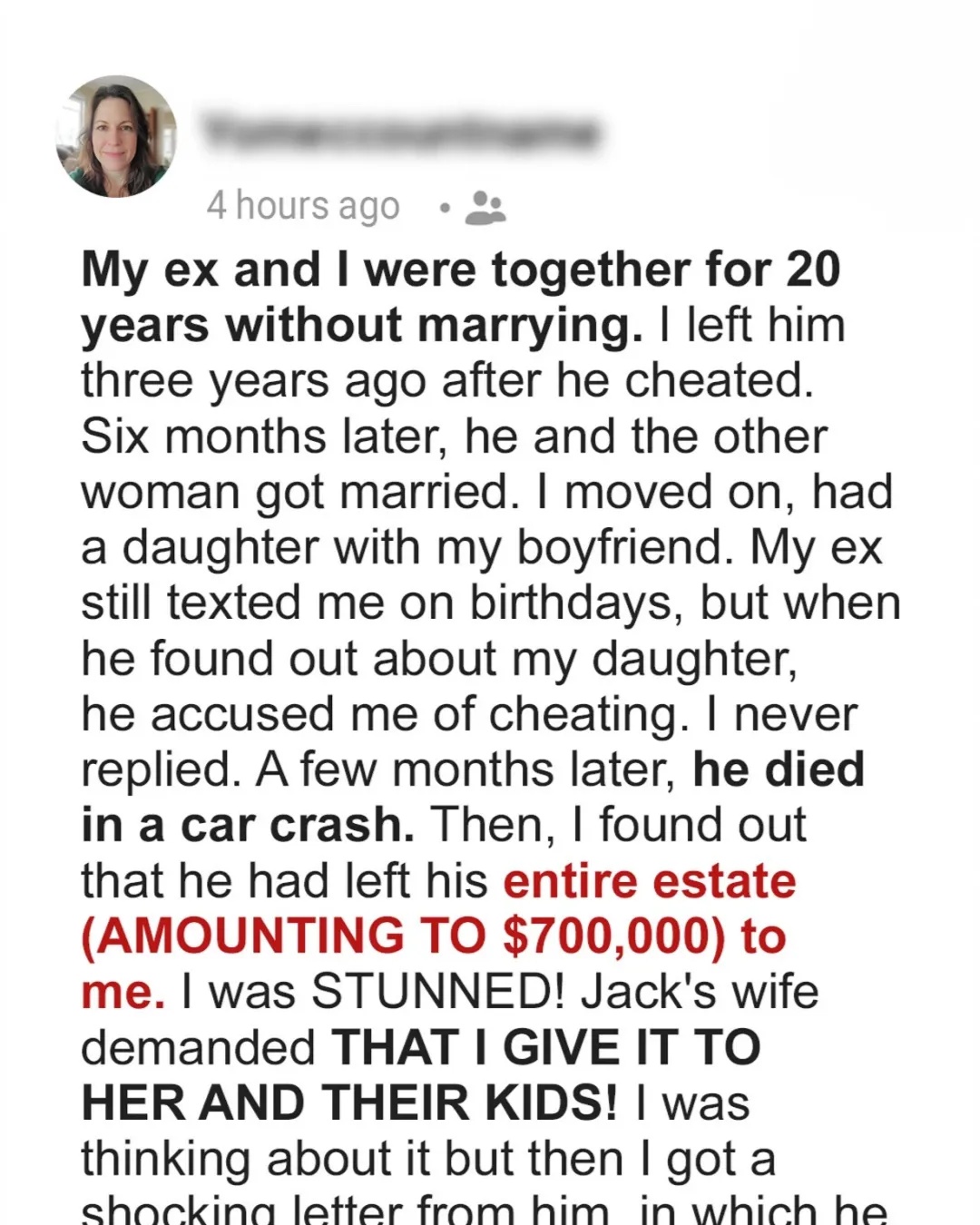 Then came the surprise I never expected: his will named me as the sole heir of his estate, nearly $700,000. I was stunned. His new wife and children were not mentioned at all, and she quickly demanded that I give everything to her. I found myself at a crossroads—torn between shock, fairness, and the heavy responsibility of honoring what he had written versus what others expected.