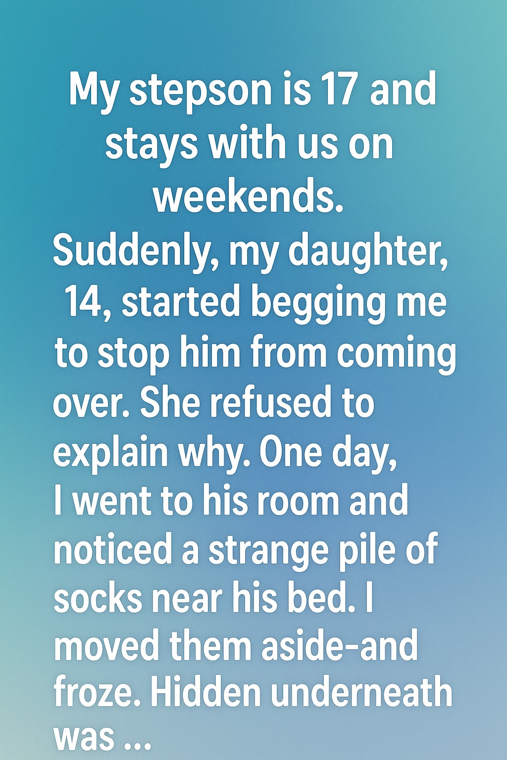 My stepson is 17 and stays with us on weekends. Suddenly, my daughter, 14, started begging me to stop him from coming over. She refused to explain why. One day, I went to his room and noticed a strange pile of socks near his bed. I moved them aside—and froze. Hidden underneath was… a small box.