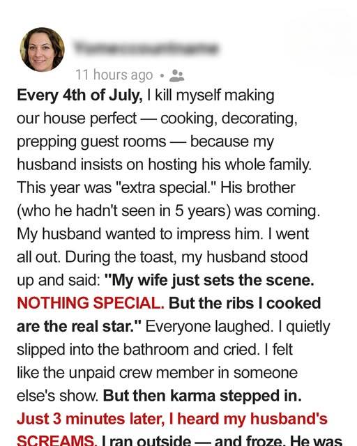 That night, Leona realized she no longer wanted to stand behind the curtain while Joel took center stage. She decided not to host the next year’s party and instead planned something for herself — a quiet evening by the lake, watching fireworks without the weight of thankless labor. For the first time in years, she looked forward to a celebration where she, too, could shine.