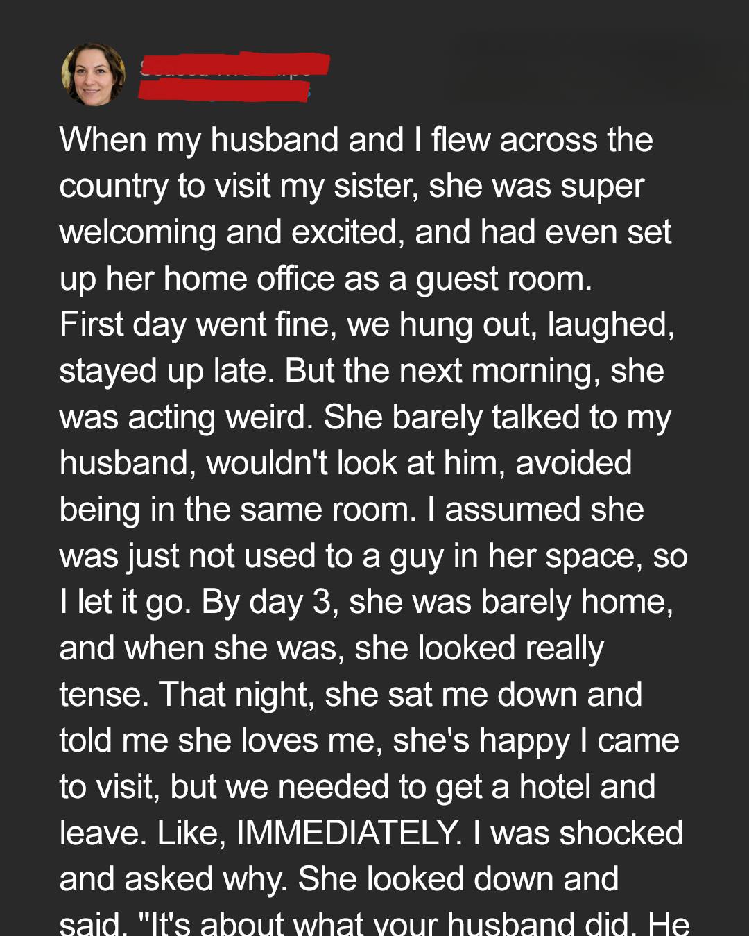 When my husband Kurt and I traveled across the country to visit my sister Sasha, she welcomed us with open arms. Her little apartment became our cozy haven, filled with laughter, late-night stories, and the joy of finally being together. For the first day, everything felt perfect. But soon, I noticed something was wrong. Sasha’s warmth faded, replaced by tension I couldn’t explain.