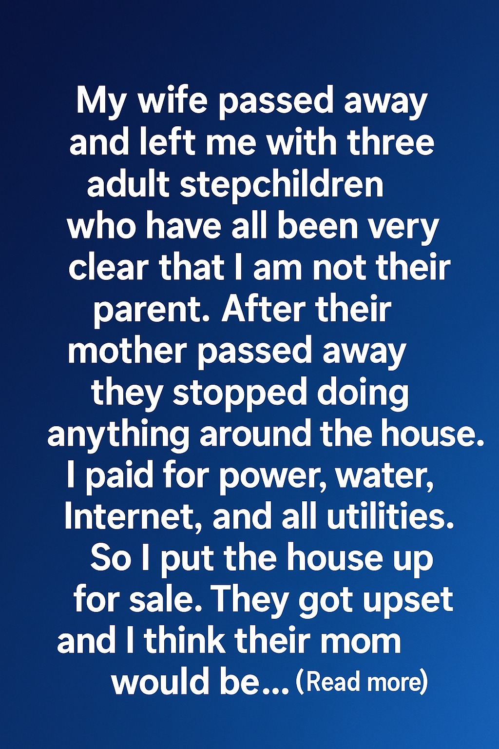 My wife passed away and left me with three adult stepchildren who have all been very clear that I am not their parent. After their mother passed away, they stopped doing anything around the house. I paid for power, water, internet, and all utilities. So I put the house up for sale. They got upset and I think their mom would be…heartbroken to see how far apart we’ve grown. I loved their mother deeply, and when she was alive, our home was warm and full of life. I always tried to be there for her children, not to replace their father, but to support them in every way I could.
