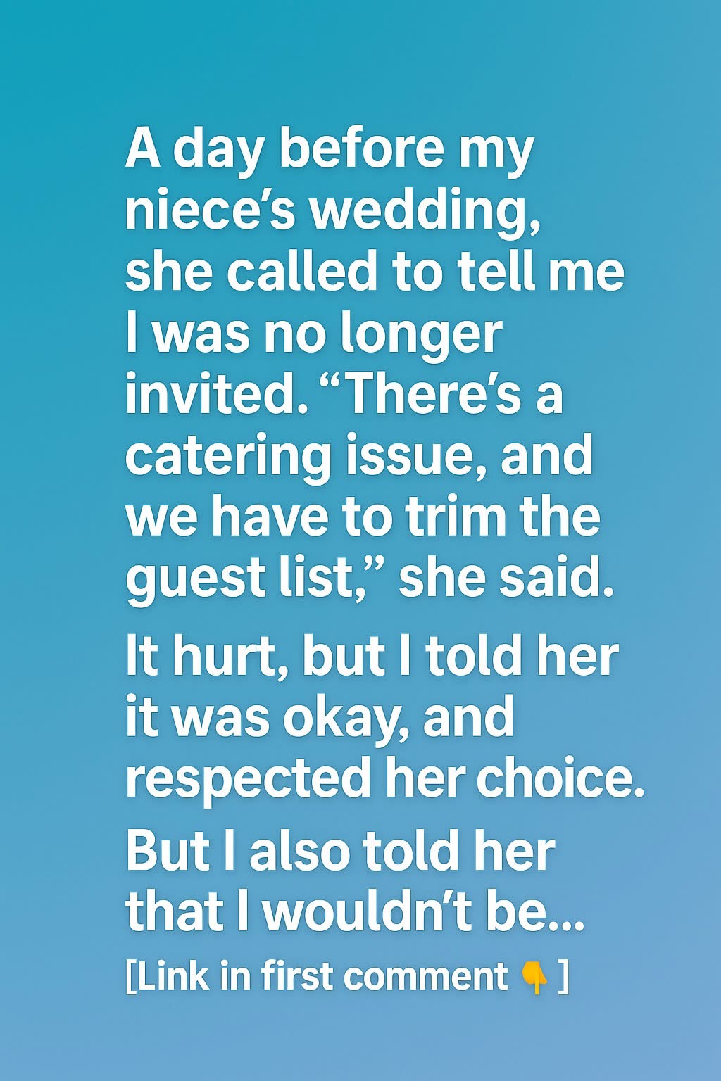 A day before my niece’s wedding, she called to tell me I was no longer invited. “There’s a catering issue, and we have to trim the guest list,” she said. It stung more than I expected, like someone had quietly closed a door I thought was always open. Still, I breathed deeply, reminded myself weddings…