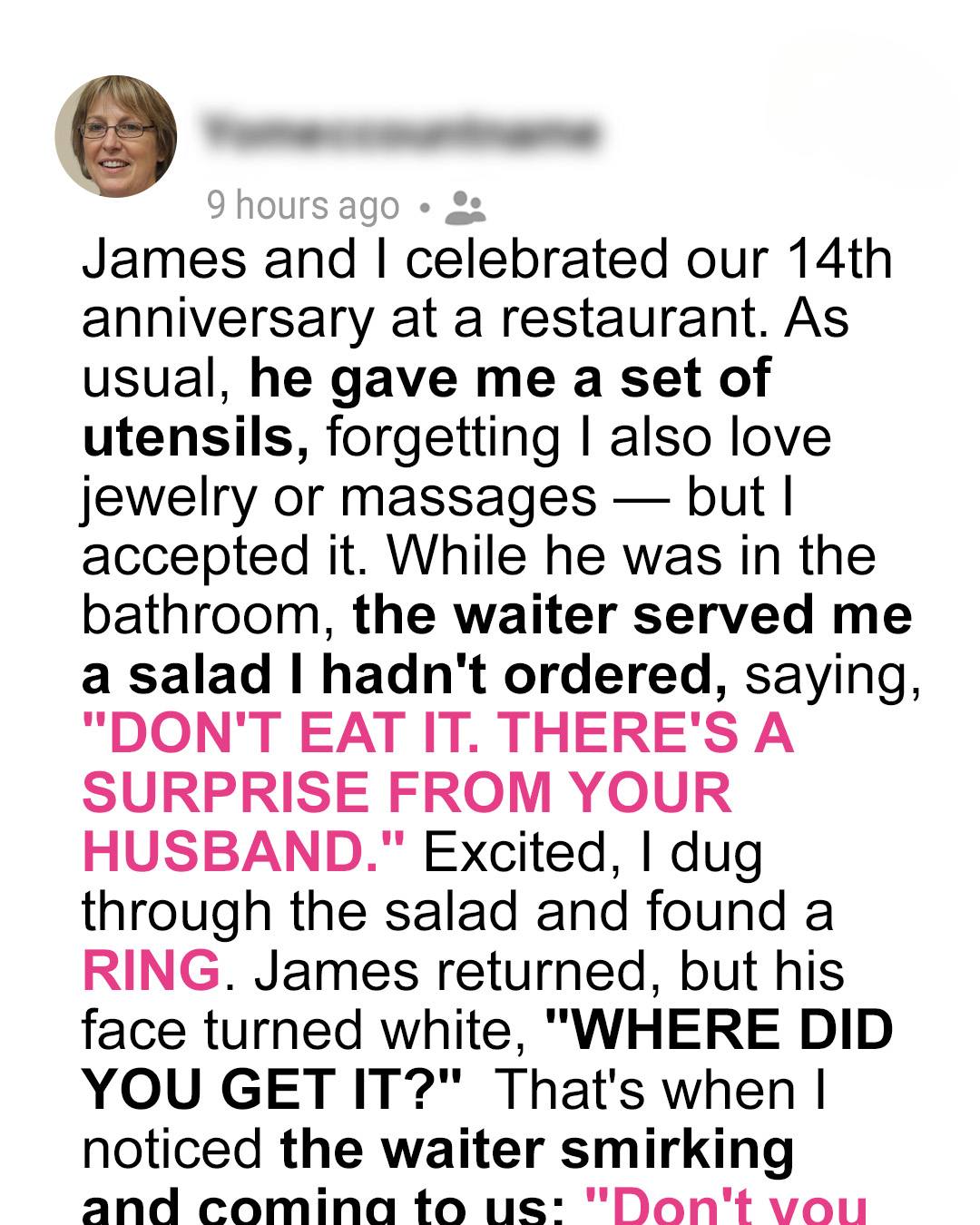 While he was gone, the waiter returned, placing a salad in front of me — a dish I hadn’t ordered. Before I could speak, he leaned closer and whispered, “Don’t eat it. There’s a surprise inside, from your husband.” My heart fluttered. Could it be that James had finally broken his pattern of dull, predictable gifts? With trembling hands, I pushed aside the lettuce until I saw it: a beautiful diamond ring glimmering among the greens. Tears filled my eyes. This was the gesture I had always dreamed of. But when James returned and saw the ring in my hand, his face turned pale. His sharp, panicked voice shattered my joy: “Where did you get that?”
