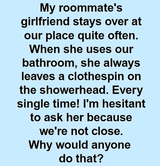 One evening, my roommate casually cleared up the mystery without me even asking. He explained that his girlfriend has a very sensitive nose and uses the clothespin to block out strong scents like soap or shampoo while showering. She leaves it on the showerhead so she won’t forget it next time. What had seemed so strange to me suddenly made perfect sense.