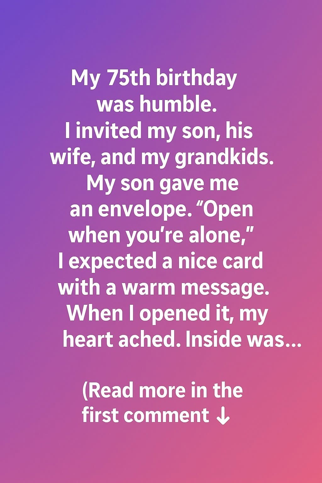 My 75th birthday was humble. I invited my son, his wife, and my grandkids. My son gave me an envelope. “Open when you’re alone,” I expected a nice card with a warm message. When I opened it, my heart ached. Inside was…a formal notice asking me to consider selling my home and moving into a…