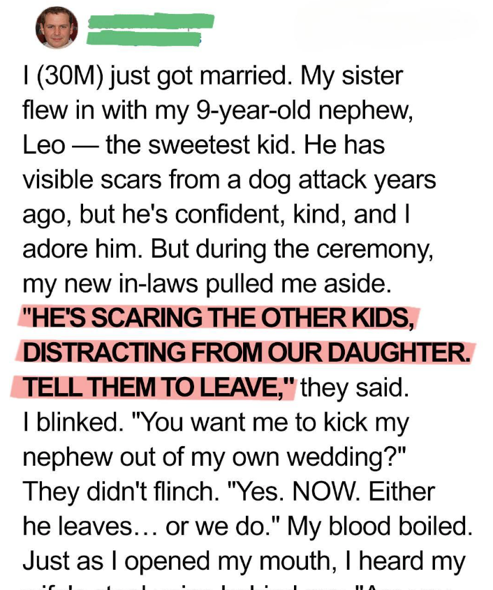 When Jack’s in-laws demanded he remove his nephew, Leo, from the wedding ceremony because of the boy’s scars, he was torn. But they didn’t expect what his bride, Emily, would do next.The chapel was filled with family and friends as Jack stood at the altar, his nine-year-old nephew proudly holding the rings beside him. Leo, who bore visible scars from an old accident, was excited to be part of the big day. His mom, Sophie, watched lovingly from the front row.