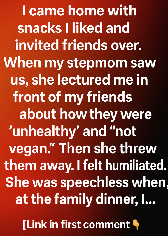 I came home with snacks I liked and invited friends over. When my stepmom saw us, she lectured me in front of my friends about how they were “unhealthy” and “not vegan.” Then she threw them away. I felt humiliated. My friends sat in stunned silence, and I could feel my cheeks burning with embarrassment.