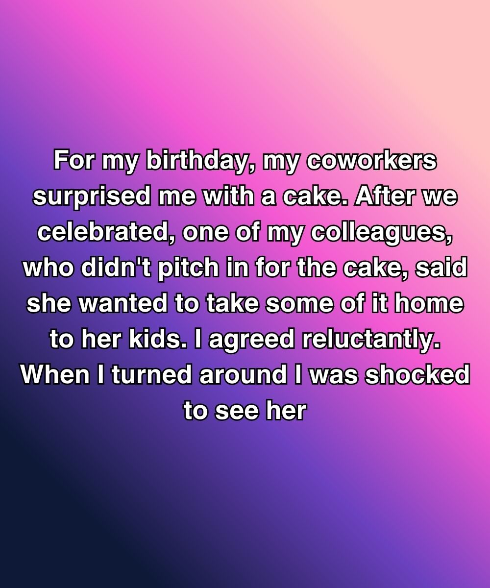 For my birthday, my coworkers surprised me with a cake. After we celebrated, one of my colleagues, who didn’t pitch in for the cake, said she wanted to take some of it home to her kids. I agreed reluctantly. When I turned around I was shocked to see her sliding the biggest chunk—like literally a quarter of the cake—into her plastic container like she’d just paid for it.