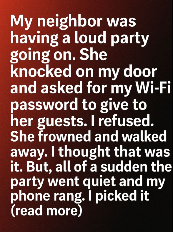 It was my neighbor. She smiled awkwardly and asked if she could have my Wi-Fi password to give to her guests because theirs wasn’t working. I was a bit surprised and politely said no, explaining that I prefer to keep my network private. She frowned, muttered a quick “Okay, thanks anyway,” and walked back to her place. I figured that was the end of it.