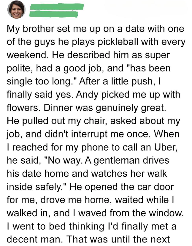 When my brother set me up on a date with his friend Andy, I wasn’t thrilled, but I agreed to go. To my surprise, Andy seemed perfect — charming, thoughtful, and even brought me flowers. Over dinner, he asked about my work, listened attentively, and treated me with kindness. By the end of the night, I started to think maybe he really was different from the disappointing dates I’d had in the past.
