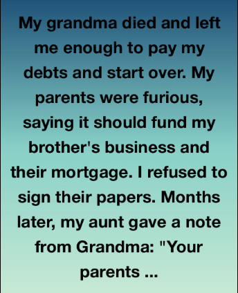 My grandma died and left me enough to pay my debts and start over. My parents were furious, saying it should fund my brother’s business and their mortgage. I refused to sign their papers. Months later, my aunt gave a note from Grandma: “Your parents will try to take this from you. Don’t let them. You’ve always been the one who needed a chance. Take it.”