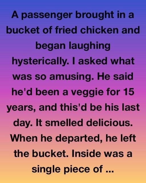 A passenger brought in a bucket of fried chicken and began laughing hysterically. I asked what was so amusing. He said he’d been a veggie for 15 years, and this’d be his last day. It smelled delicious. When he departed, he left the bucket. Inside was a single piece of golden, crispy fried chicken—steaming, glistening, sitting like a crowned jewel in the middle of the box.