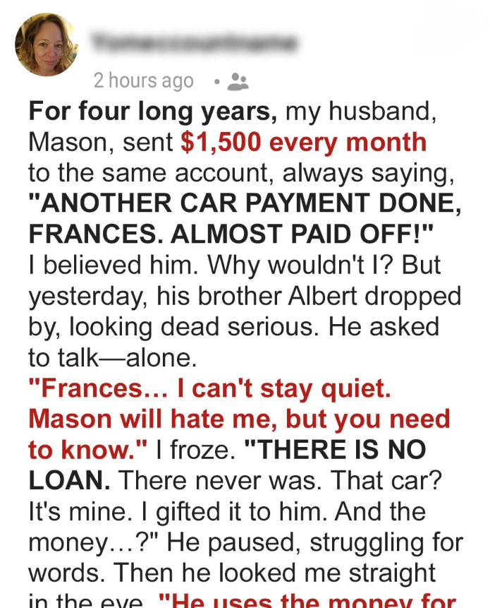 For years, I trusted my husband, Mason, as he assured me he was paying off our car loan of $1,500 a month. I believed him until his brother, Albert, knocked on my door with a truth that changed everything.It was a rainy afternoon when Albert confessed. He told me there was no car loan—it was Mason’s brother’s car, paid off seven years ago. And the money Mason was supposedly using for the car? It was going to someone else: Beverly, his other partner.