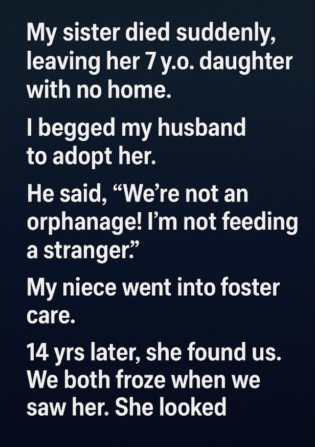 When my sister passed unexpectedly, her seven-year-old daughter suddenly had nowhere to go. With love and worry pulling at my heart, I begged my husband to take her in. He refused, insisting we couldn’t take on more responsibility. With no other family prepared to step in, my niece entered foster care. Fourteen years passed, and then one quiet afternoon, she stood at my door — no longer a frightened child, but a young woman filled with calm confidence and unmistakable strength.