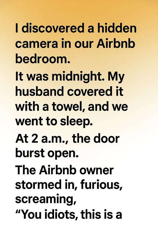 Around 2 a.m., our worst fears came true. The door burst open so violently that it hit the wall, and the man from the Airbnb listing — the host himself — stormed inside, shouting. “You can’t cover that camera! It’s part of the house system!” His words didn’t even make sense. My heart pounded as my husband stepped forward, calm but firm. “This is private space,” he said. “You can’t just enter our room — and you definitely can’t film it.” The man glared, muttered something under his breath, and slammed the door behind him. The silence afterward was deafening, broken only by the sound of my hands shaking as I stuffed our belongings back into the suitcase. It was clear: we weren’t safe there.