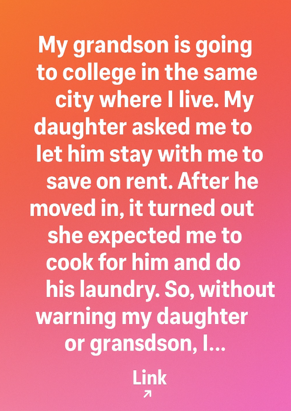 When my grandson got accepted into a college in the same city where I live, my daughter suggested that he stay with me to save on rent. I agreed because I was happy to help and thought it would give me a chance to spend more time with him.However, after he moved in, I quickly realized that my daughter had a different idea of what this arrangement would look like. She expected me to cook his meals, do his laundry, and essentially take care of him as though he were still a child.